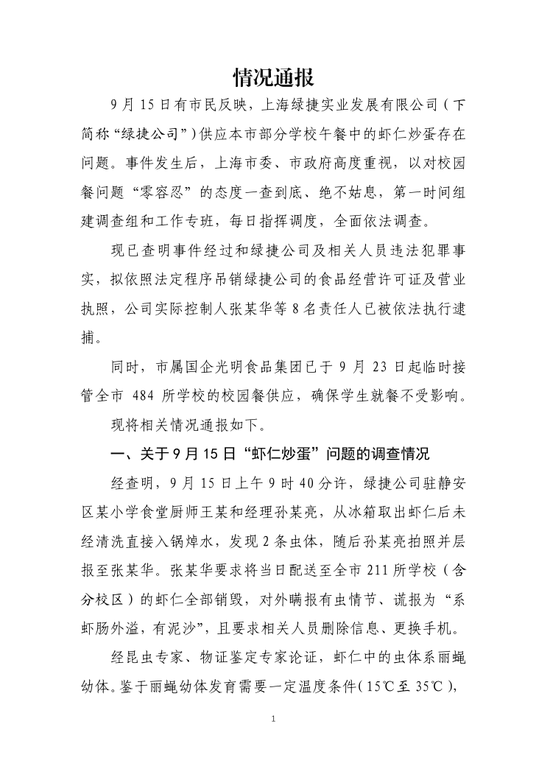 上海市市场监督管理局发布情况报告。 9月15日,有市民反映,上海绿街实业发展有限公司(以下简称“绿街公司”)在本市部分学校午餐中添加虾仁炒鸡蛋存在问题。事件发生后,上海市委、市政府高度重视学校午餐问题,并以零容忍的态度将此事调查到底。他们立即成立调查组和专案组,每日出动,依法严查。